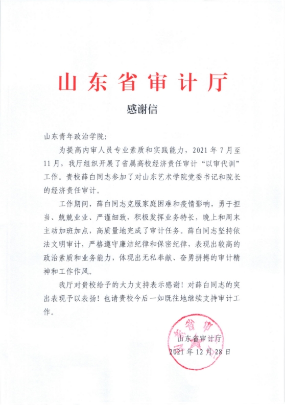 12月28日,我校收到山东省审计厅发来的感谢信(详见附件:感谢信),对我校大力支持省审计厅组织开展的2021年度省属高校主要领导人员经济责任审计“以审代训”工作表示感谢,对参加此次审计工作的薛白同志予以高度评价。信中写道:“薛白同志克服家庭困难和疫情影响,勇于担当、兢兢业业,严谨细致,积极发挥业务特长,晚上和周末主动加班加点,高质量完成了审计任务”“薛白同志坚持依法文明审计,严格遵守廉洁纪律和保密纪律,表现出较高的政治素质和业务能力,体现出无私奉献,奋勇拼搏的审计精神和工作作风”。对薛白同志的突出表现予以表扬,对我校对省审计厅审计工作的大力支持表示感谢!